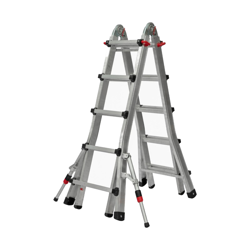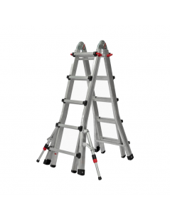 Escalera telescópica multifunción profesional de aluminio. Se puede cambiar en 3 posiciones diferentes: extensible, tijera y para trabajo en desnivel. Con estabilizadores para evitar vuelcos, en cumplimiento de la normativa europea de escaleras portátiles EN 131-1:2015+A1:2019